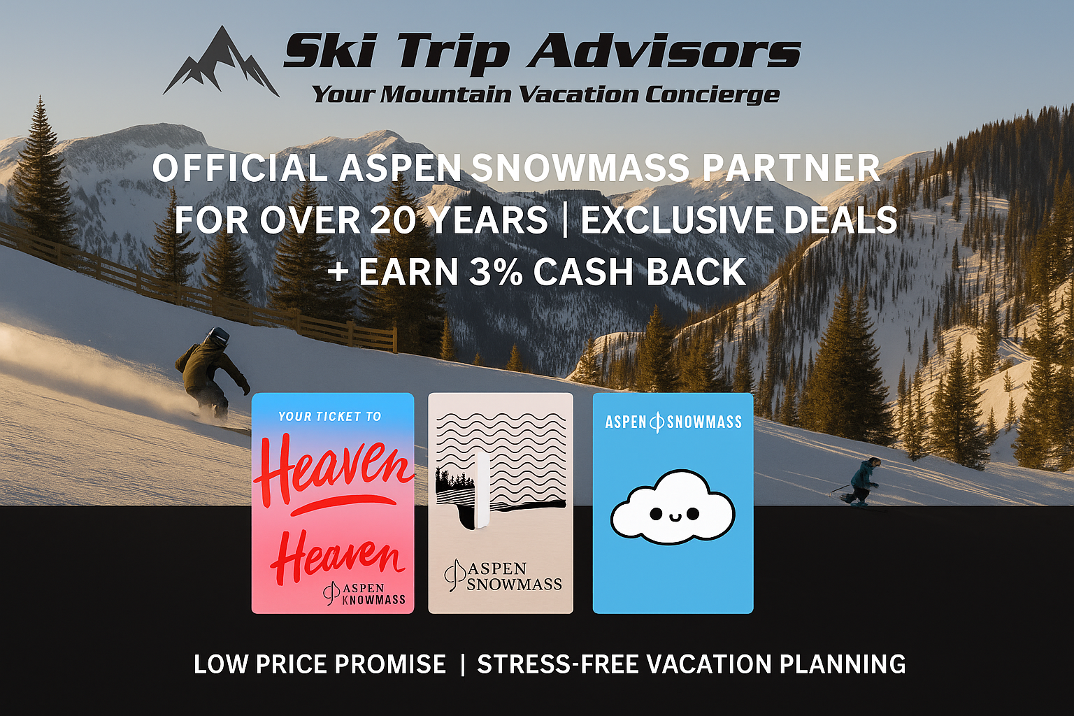 Every Aspen Snowmass Lift Ticket or Lift Ticket Package booked through Ski Trip Advisors earns a 3% cash-back reward—apply it toward a future trip or cash it out after April 1, 2026. (Offer not valid with promotional or coupon codes. Excludes ski school products.)